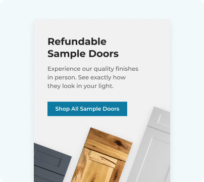 Highlighted commitment reducing programs in context, including free design help and refundable sample doors, so reassurance appears at the moment shoppers weigh risk.